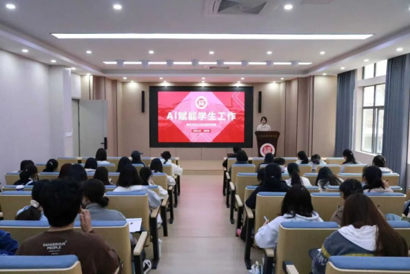 团校部负责人陈天朗担任主讲,围绕“AI赋能青年力量,科技领航实干效能”开展AI技能专题分享,全院青马学员参与学习。