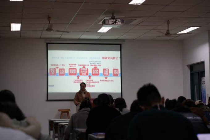 在工作流程方面,赵艳莉老师具体讲解入党的五个环节和三十个步骤,对“申请入党、确定入党积极分子、确定发展对象、接收预备党员、预备党员转正”五个环节逐一进行分析。同时,赵艳莉老师还列举党员发展工作流程中的一些实例,帮助大家加深对工作过程细节的理解和把握。