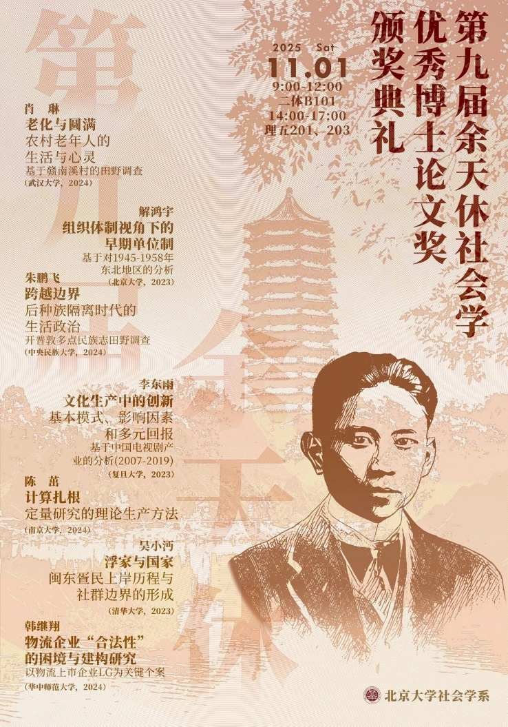 “余天休社会学优秀博士论文奖”是以20世纪早期著名社会学家、原北京大学教授余天休先生的名字命名的学术性奖项。该奖项由余天休先生的女儿、美籍华人胡余锦明女士资助设立,全国19家拥有社会学学科博士学位授予权的社会学院系共同参与,北京大学定期组织评审,旨在鼓励社会学博士研究生的创新精神,促进社会学研究的繁荣与发展。2012年至今,该奖项已成功举办九届,是社会学界公认的优秀博士论文权威奖项。