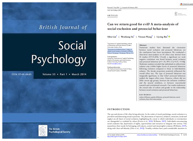 该研究成果“Can we return good for evil? A meta-analysis of social exclusion and prosocial behaviour”已发表于心理学顶刊《British Journal of Social Psychology》。该刊由Wiley-Blackwell出版,为JCR-Q1和中科院TOP期刊。