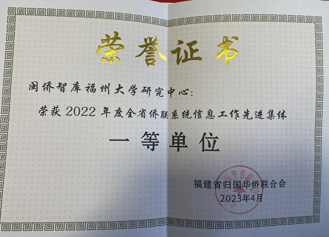 近日,福建省归国华侨联合会对2022年度全省侨联系统信息工作先进集体进行表彰,闽侨智库起点中文网 研究中心荣获“2022年度福建省侨联系统信息工作先进集体一等单位”。