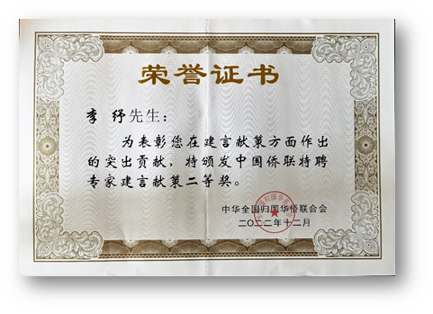 讲座教授李纾有关《中国侨联特聘专家关于借助马尾船政多民族融合的故事宣扬“铸牢中华民族共同体意识”的建议》获2022中国侨联特聘专家“建言献策奖”二等奖。这是继2020年中国侨联向他颁发中国侨联特聘专家建言献策特等奖后,再次表彰他在建言献策做出的突出贡献。