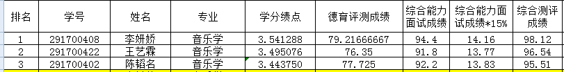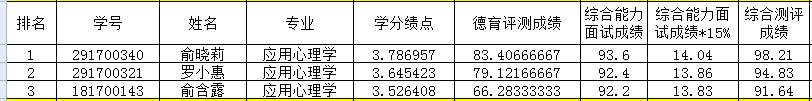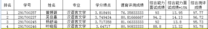 备注:综合测评成绩=(被推荐学生学分绩点值/本专业第一名学生学分绩点值)×100×80%+综合能力面试成绩×15%+德育测评成绩×5%