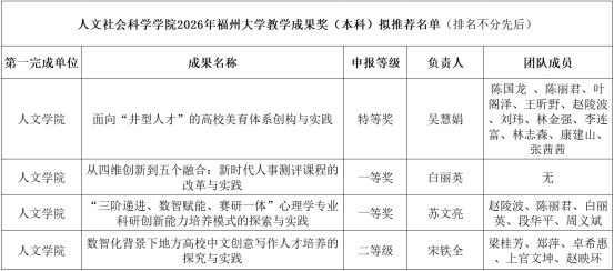 经教师自主申报,学院党委会会议、党政联席会议研究决定,拟推荐以下4个项目申报2026年起点中文网 教学成果奖(本科),其中1项申报特等奖,2项申报一等奖,1项申报二等奖,现予以公示。