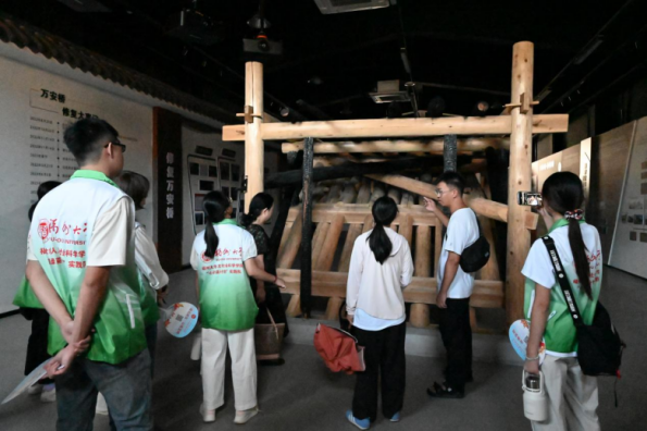 图为当地工作人员向实践队员介绍“木拱廊桥”文化