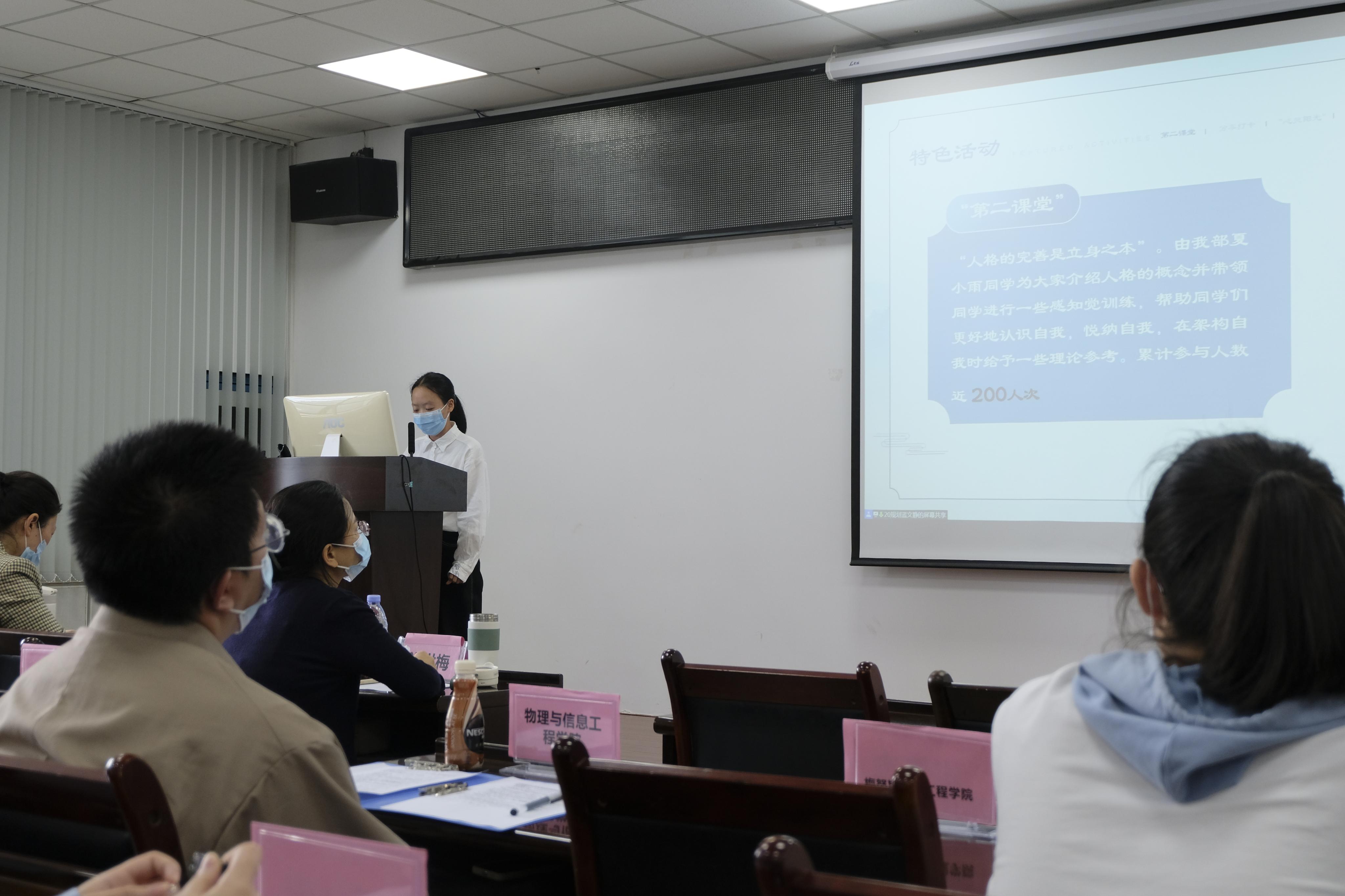 黄佳敏同学先是通过视频的形式介绍自己心理服务的相关经历,接着通过PPT展示与演讲相结合的形式进行工作汇报。“勇气也是运气的敲门砖。”从刚开始的懵懂,到后来能成功举办社区青少年心理公益讲座,她经历了很多困难,也成长了很多。在参与心理学社的活动和活动后与老师、同学们的交流反馈中,她也逐渐认识到作为朋辈互助员的意义,并在活动中不断学习与成长。