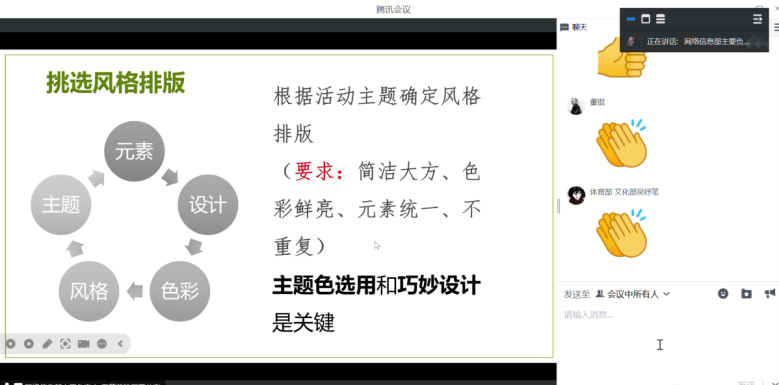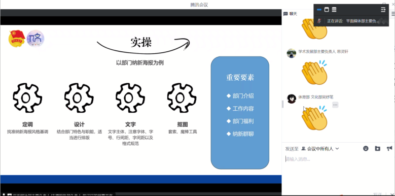 2024届记者团主要负责人陈怡萱以新闻五部分为线索,介绍新闻稿写作常用技巧。2024届视觉传媒部主要负责人曾晨引入“会议三要素”,并详细说明各类摄影的相关要点。2024届网络信息部主要负责人王艺菡阐明推文制作及审核流程,强调排版风格的重要性。通过实例演习,2024届平面媒体部主要负责人陈江钰讲解海报设计的相关原则和PS软件的部分基础操作。