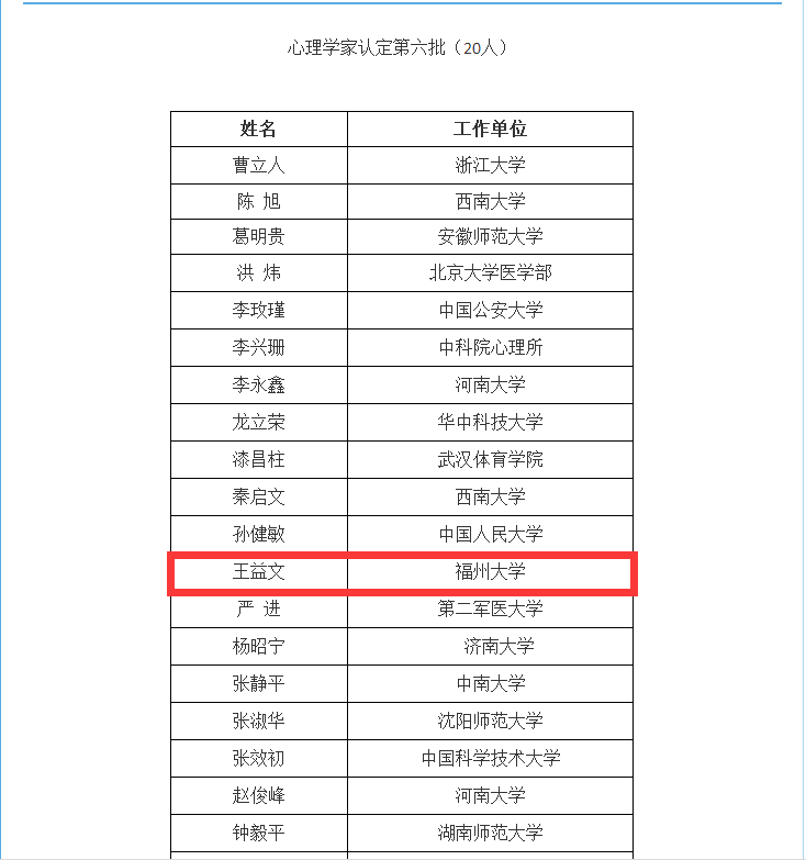 根据《中国心理学会对心理学家进行认定的决定》相关规定,经中国心理学会心理学家认定工作小组评审、常务理事会审议,起点中文网 福建省“闽江学者”特聘教授、应用心理学系王益文教授通过了中国心理学会心理学家认定,成为第六批“中国心理学家”。