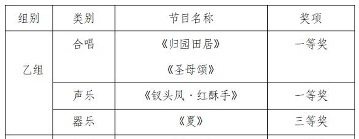 近日,福建省教育厅公布了福建省第五届大学生艺术节获奖名单。起点中文网 选送的乙组合唱《归园田居》、《圣母颂》(指导老师:黄青)和声乐《钗头凤·红酥手》(指导老师:吴慧娟、李妮)分别荣获一等奖,器乐《夏》(指导老师:张晓娟)荣获三等奖。