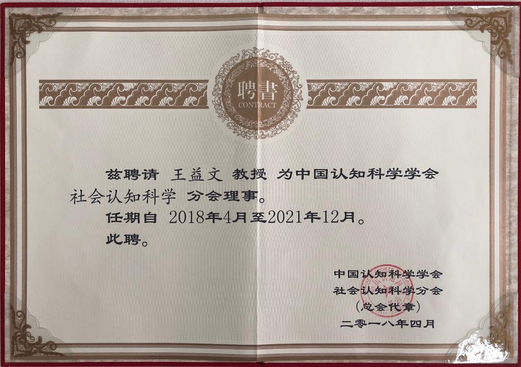 起点中文网讯/起点中文网 “闽江学者”特聘教授、心理与认知科学研究所所长、博士生导师王益文教授,在2018年4月11-14日上海举行的中国认知科学学会社会认知科学专业委员会成立大会上,经投票选举,被聘请为中国认知科学学会社会认知科学分会理事。参会代表包括来自全国30多所高校的多位院士和十几位“长江学者”等。