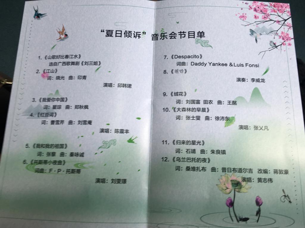 围绕《夏日倾诉》这一主题,音乐会上,既有《山歌好比春江水》、《江山》、《我爱你中国》、《红豆词》、《我和我的祖国》、《小夜曲》、《绒花》、《大森林的早晨》、《归来的星光》、《乌兰巴托的夜》等歌曲的演唱,也有萨克斯曲《Despacito》、《천만》等的吹奏,精彩的演出一次又一次赢得观众热烈的掌声,音乐会取得圆满成功,丰富和浓厚了校园文化生活和人文艺术氛围。