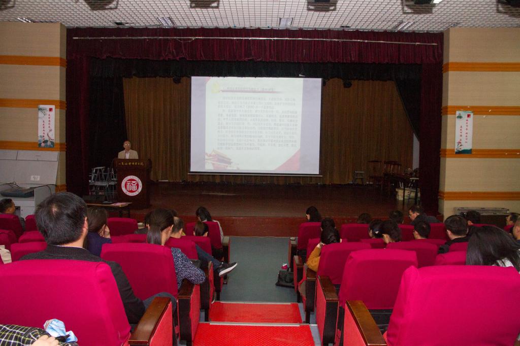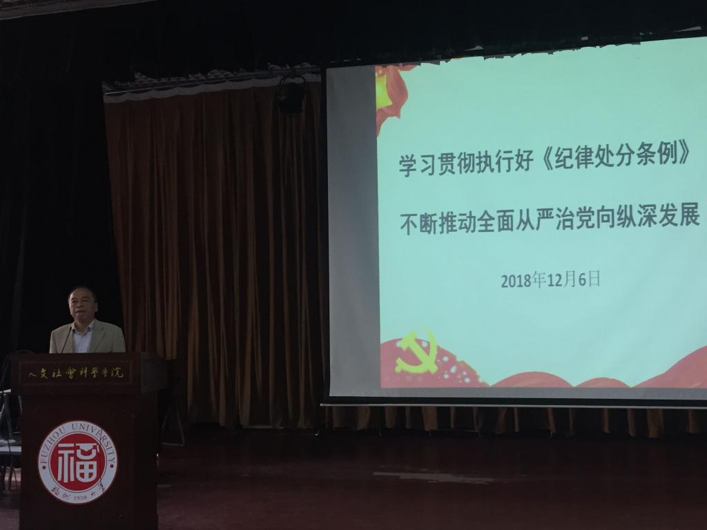 在人文艺术实践基地召开全院党员党风党纪教育学习会,由院党委书记林秋生作《学习贯彻执行好< 纪律处分条例>,不断推动全面从严治党向纵深发展》的专题报告。学院教师党员、学生党员共计120余人听取了此次报告会。