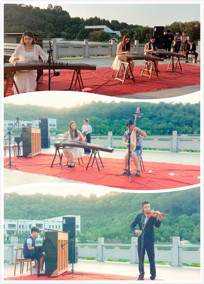 泼一抹墨色,国风脉脉。调几声弦音,民韵悠悠。民族器乐曲同样带给我们内心深处的触动。由朱茜等同学带来的古筝三重奏《步步高》旋律跌宕起伏,给人以奋发向上的情绪;由彭思雨指挥,彭璐等同学演奏的民乐重奏曲《大鱼》,以及由陈苇杭等同学带来的民乐流行曲《权御天下》,在品味国乐经典的同时,令人耳目一新。而小提琴和钢琴合奏日本宫崎骏动画片《龙猫》的主题曲,一下子就把我们带入到天真无邪的童年时光。