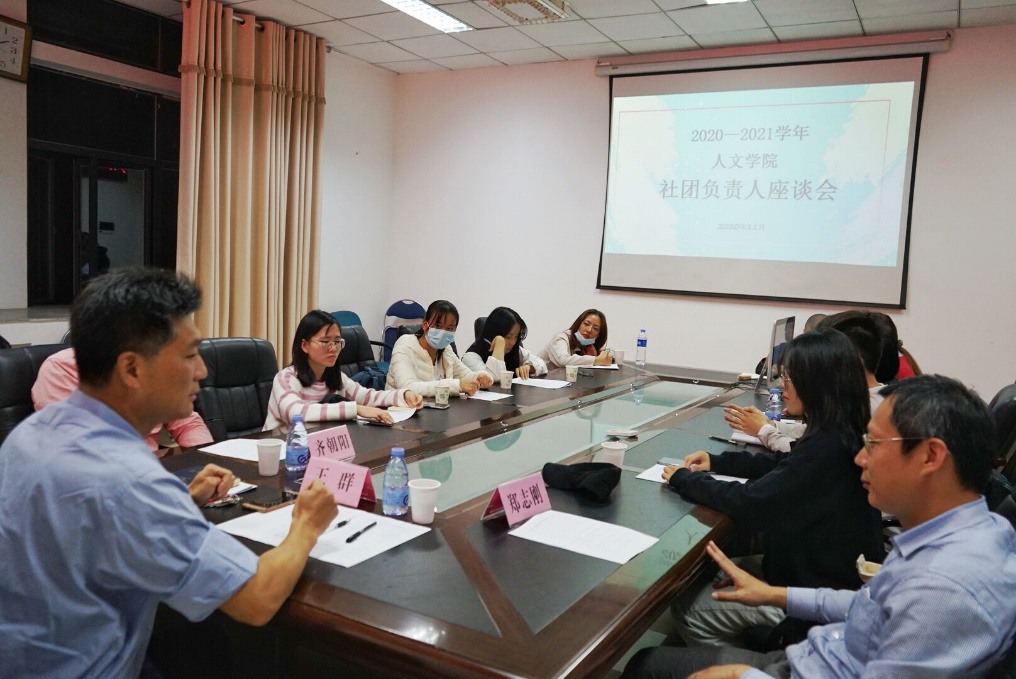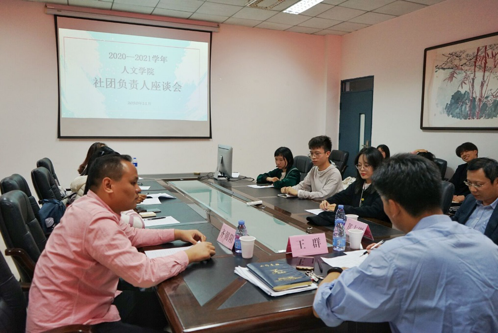 社团负责人进行座谈会指导,钟声文学社代表周冠宁、社会调查协会代表钟慧岚、潮韵文学社代表张江蘭、丑石听潮书画社代表吕俊瑶、赖生话剧社代表彭思雨、民乐团代表彭璐等12个社团代表参加了此次座谈会。
