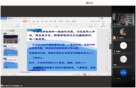 梁老师的党课从吟诵与朗诵的区别出发,先讲解了其概念,然后结合优质的音频案例,配合幻灯片,系统而详实地向在座党员介绍了古诗词吟诵的相关知识,包括吟诵的发展史、方法以及传承的价值。梁老师提到,吟诵诗词的传统在日本、韩国等很多汉文化圈国家中一直流传,我国的传统却日渐式微、缺乏传承。“读书声出金石,飘飘意远”,作为中国汉语古诗词文的活态,吟诵目前已然成为需要抢救的非物质传统文化遗产。而中华优秀传统文化是中华民族的“根”与“魂”,“优秀传统文化是一个国家、一个民族传承和发展的根本,如果丢掉了,就割断了精神命脉”,“弘扬传统文化也是我们党员的责任和义务”。因而,梁老师指出,针对本专业的党员来说,此次党课不仅是应知应会的一门对口必修课,更是传承优秀传统文化、坚定文化自信的源泉活水,是使我们党员坚守中华文化立场、传承中华文化基因、展现中华审美风范,自觉地用中华优秀传统文化滋养中国特色社会主义实践的现实需要。