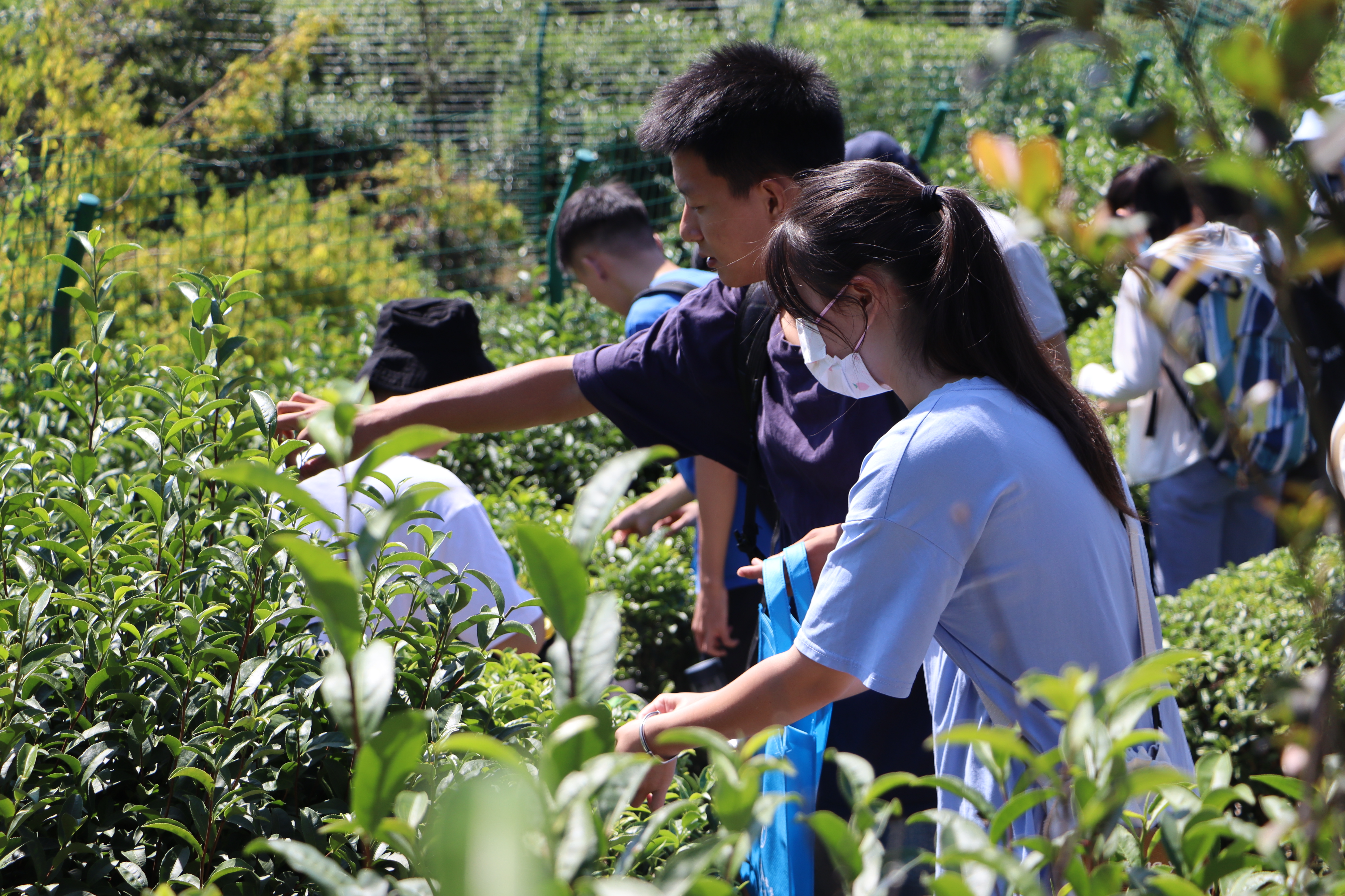 走进茶园,体悟劳动乐趣。烈日当空,一垄垄修剪齐整的茶树散发阵阵清香。正式开始前,王群书记为同学们示范采茶动作,讲解采茶技巧,亲切指导同学们进行采摘工作。了解基本的采摘方法后,同学们穿梭在茶树丛中,轻捻茶叶、观察色泽、细嗅茶香,在实践中全方位感受茶的魅力。