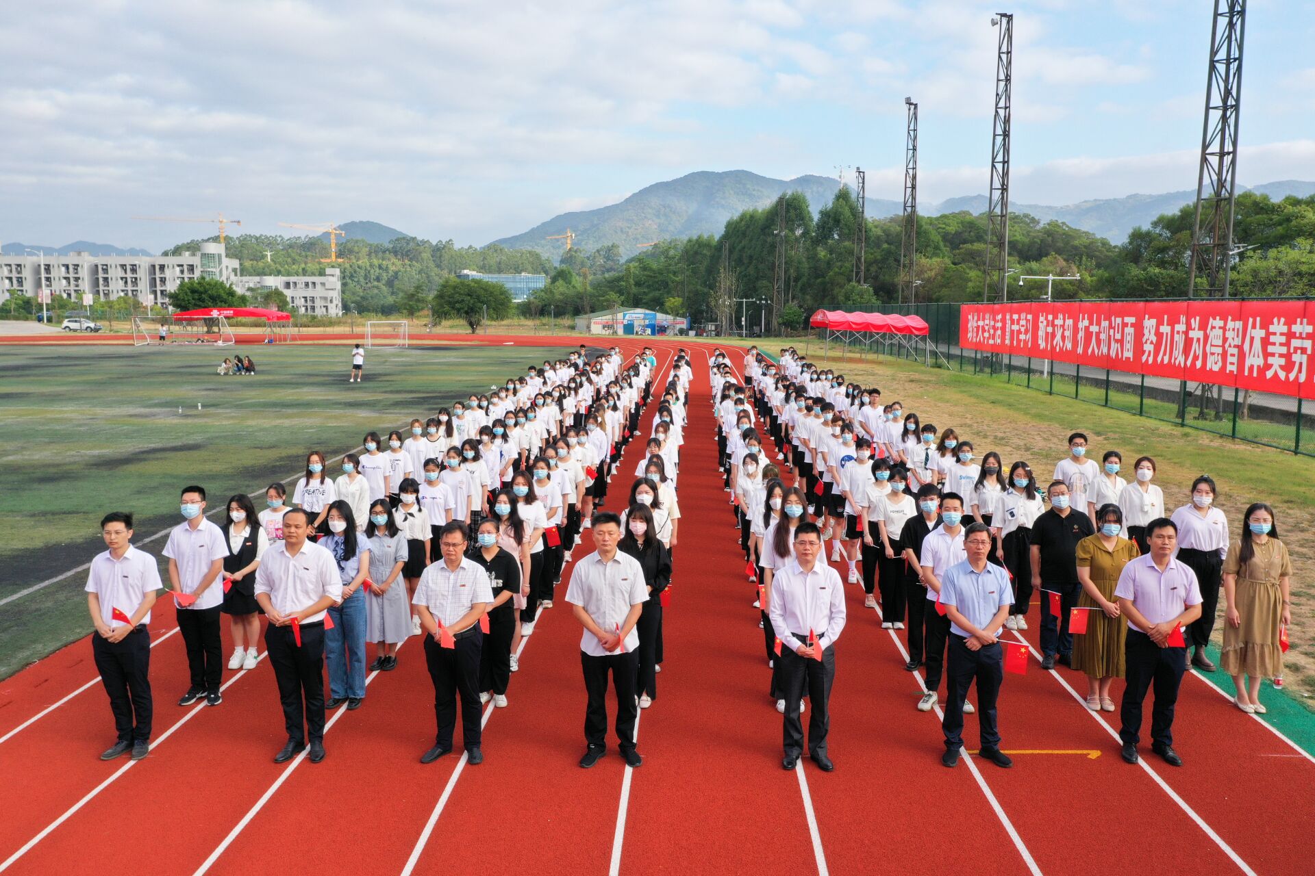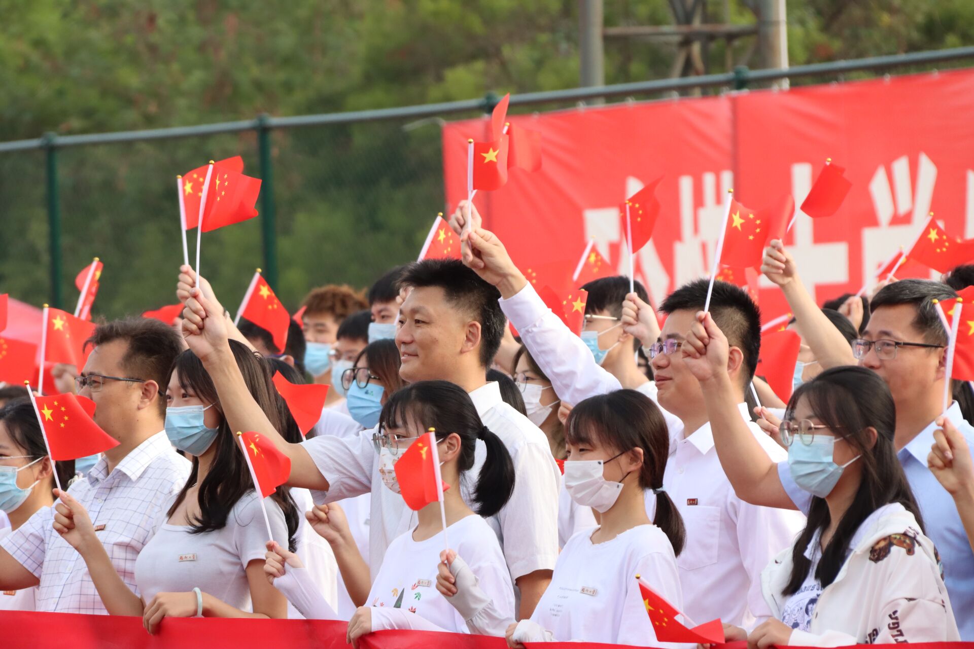 师生整齐列队,心潮澎湃、整装肃立,在田径场准备升旗。雄壮的国歌声响起,升旗手振臂一挥,五星红旗迎风飘扬,缓缓升起。鲜艳的红像火一般热情,响亮的歌声像雷一样震撼,为即将到来的二十大点燃激情奏响乐章。