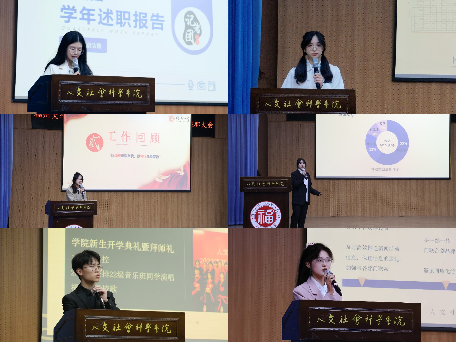 大会上,各部门负责人依次从部门介绍、年度总结以及未来发展等方向进行总结报告。记者团负责人谢洁寰以“打造‘做’的态度,营造‘家’的氛围”总结一年来的努力工作。对于部门的定位,文化部负责人总结到“以更好的行动承接人文精神,用实际行动传达人文精神。”团委组织部以“重效率、提质量、严要求、勤学习”作为未来的规划目标。而网络信息部以“高定位、重时效、促协同、创品牌、多思考、显温度”来对部门年度工作进行总结,并以此为基点,为网信部的工作作出规划。本次述职大会,不仅有“以热爱充盈自我,以笃行奉献青春”的宣言,更有起点中文网