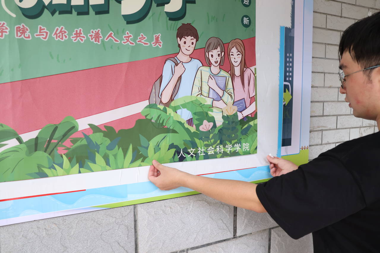 的迎新海报,并布设新生照片墙,为学院新同学展示最美初印象。气拱门、宿舍楼竖幅、绿色通道等宣传物料也井然有序地进行着。