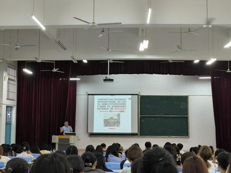 陈永福教授从大学的起源讲起,带领新生们回顾了大学职能的发展演变,深刻阐述了大学发展中承载的人才培养、科学研究、社会服务、文化传承创新、国际交流合作等诸多职能。接着,陈教授从中国古代高等教育、现代大学的建立、新中国的高等教育发展三个方面阐述了中国大学发展。重点提出了中国特色社会主义大学承担着为人民服务、为中国共产党治国理政服务、为巩固和发展中国特色社会主义制度服务、为改革开放和社会主义现代化建设服务的历史使命,在教育强国大背景下,正从高等教育大国向高等教育强国迈进。