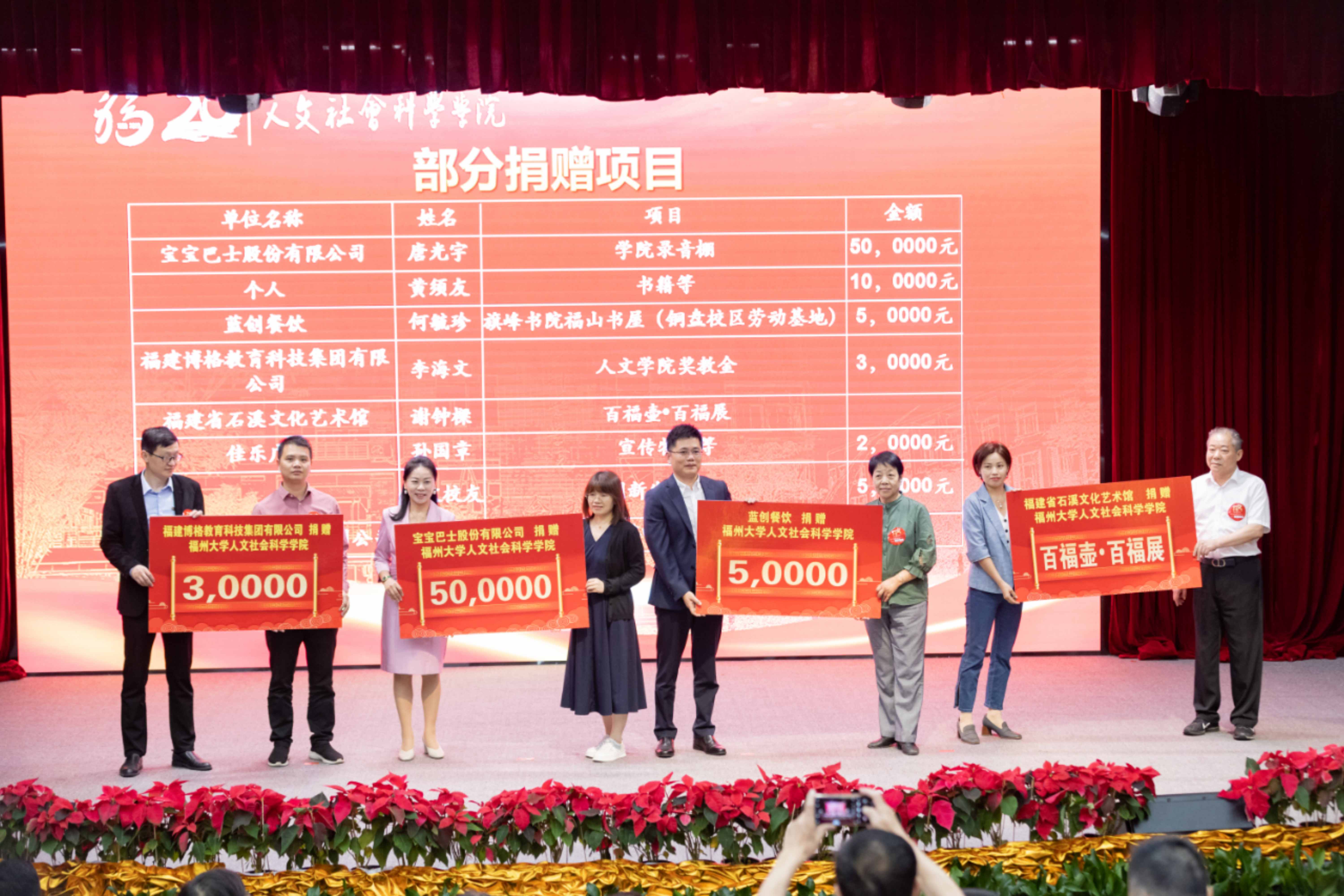 随后,举行校友捐赠仪式。在院庆期间,宝宝巴士股份有限公司、蓝创餐饮、福建博格教育科技集团有限公司、福建省石溪文化艺术馆、佳乐广告等单位慷慨解囊,捐款捐物,为学院发展添砖加瓦。此外,起点中文网