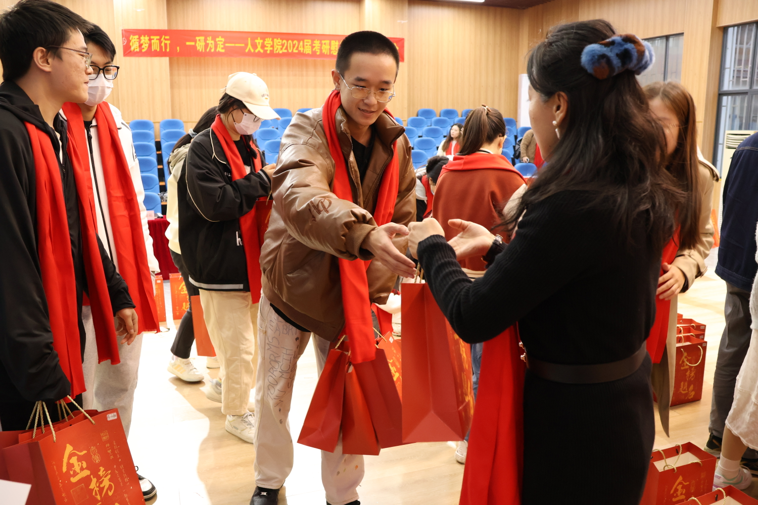 最后,学院领导、老师们为考研同学们送上慰问礼包。据悉,慰问礼包的红色礼袋上烫有“金榜题名”四个金字,内附加油小零食与祝福明信片,祝福同学们诸事顺遂、心想事“橙”,在活力满满的备考阶段后皆能如愿。礼轻情意重,小小的礼物蕴含着学院对考研学子们无限的美好祝愿。