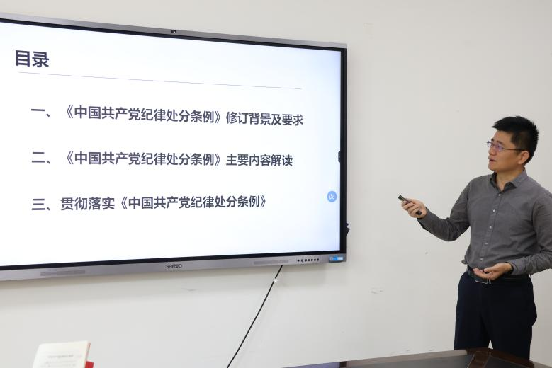 学院党委副书记、纪委书记陈永福作《中国共产党纪律处分条例》解读。陈永福副书记回顾《条例》历次修订情况,并以《条例》三编为线索,讲解总则部分的“一个指导思想、两个‘坚决维护’、三个重点查处、监督执纪的四种形态”,逐章介绍党员政治纪律、组织纪律、廉洁纪律、群众纪律、工作纪律、生活纪律六方面的相关要求,重点强调部分易混淆点和本次修订的新增内容。