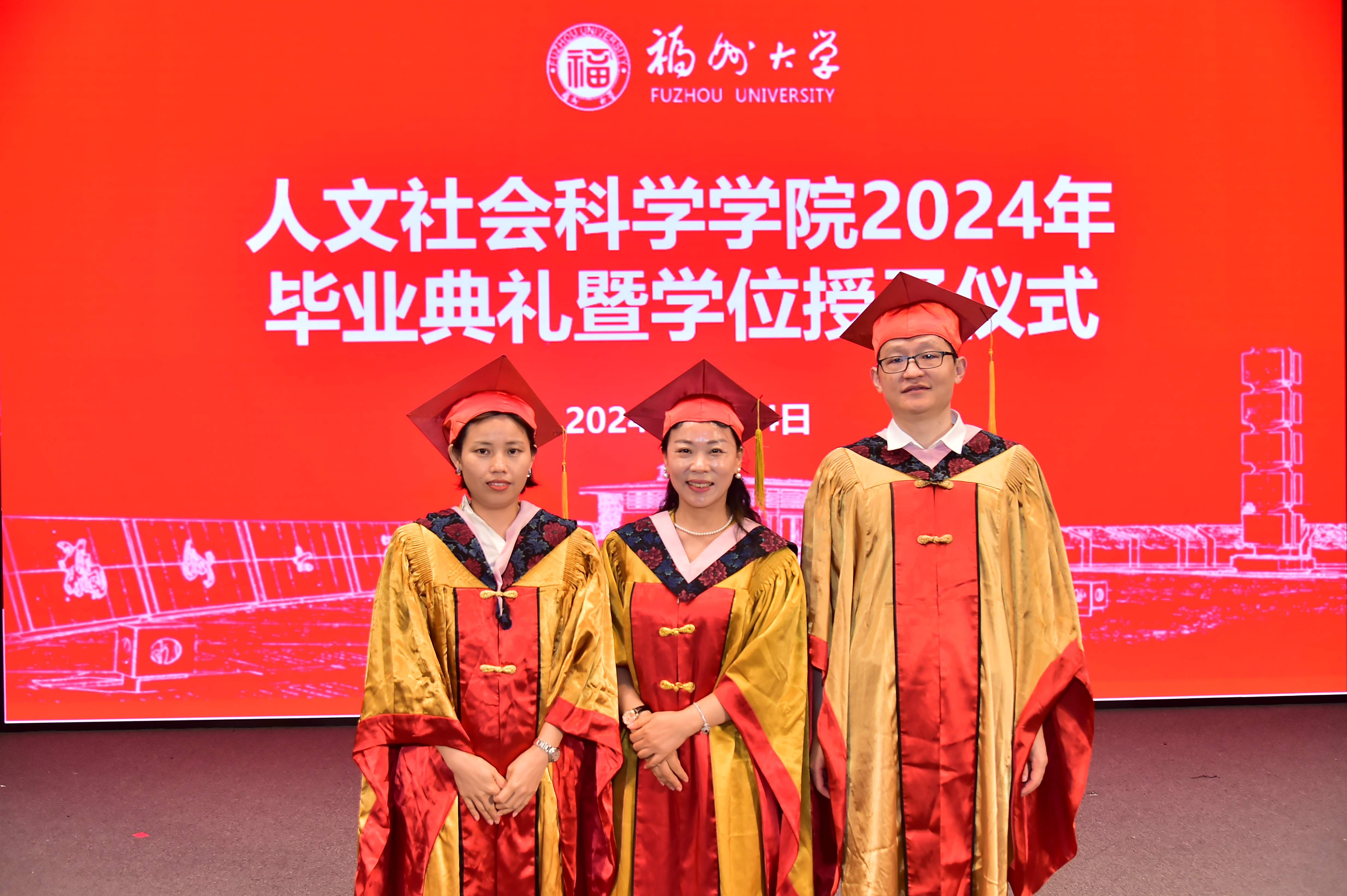 毕业典礼后的学位授予仪式上,院长吴慧娟教授、副院长林胜教授、副院长陈丽君教授为毕业生颁授学位证书,执拨穗礼。