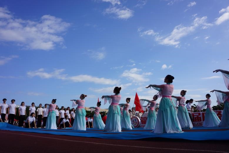 入场式方阵精神饱满,姿态昂扬,步伐矫健,列队整齐,舞动青春绚烂风采,一展青年自信活力。青粉交织,渲染诗意;霓裳羽衣,挥斥方遒。随着古典明快的伴乐奏响,学子以舞献礼,手摇古扇,一张一合,纤腰灵动,裙袖流转,舞姿轻盈,衣袂飘摇。而穿插于队列的蓝色条带,如河如海,为表演赋予澄澈底色。