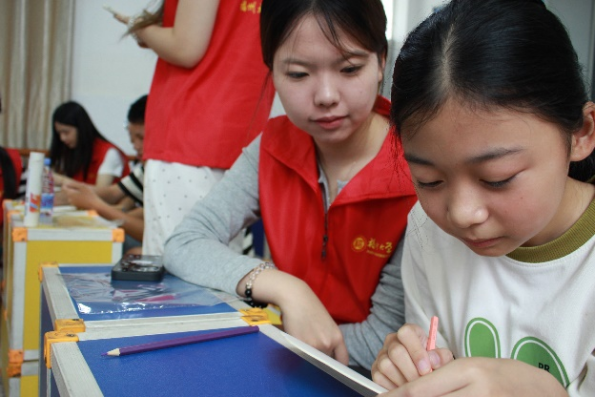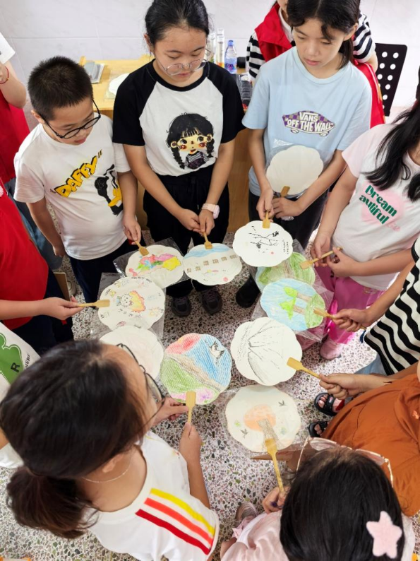 手工绘制扇面环节将创意与祝福融为一体。在实践队员的耐心引导下,孩子们纷纷拿起画笔,选择心仪的地域文化元素:有的勾勒出雄鸡报晓般的祖国版图,有的描绘着蜿蜒千年的万里长城……小小的扇面,承载着孩子们对“一带一路”的童真想象和对祖国繁荣昌盛的美好祝愿。画笔流转间,文化交融、美美与共的理念悄然播撒在心田。